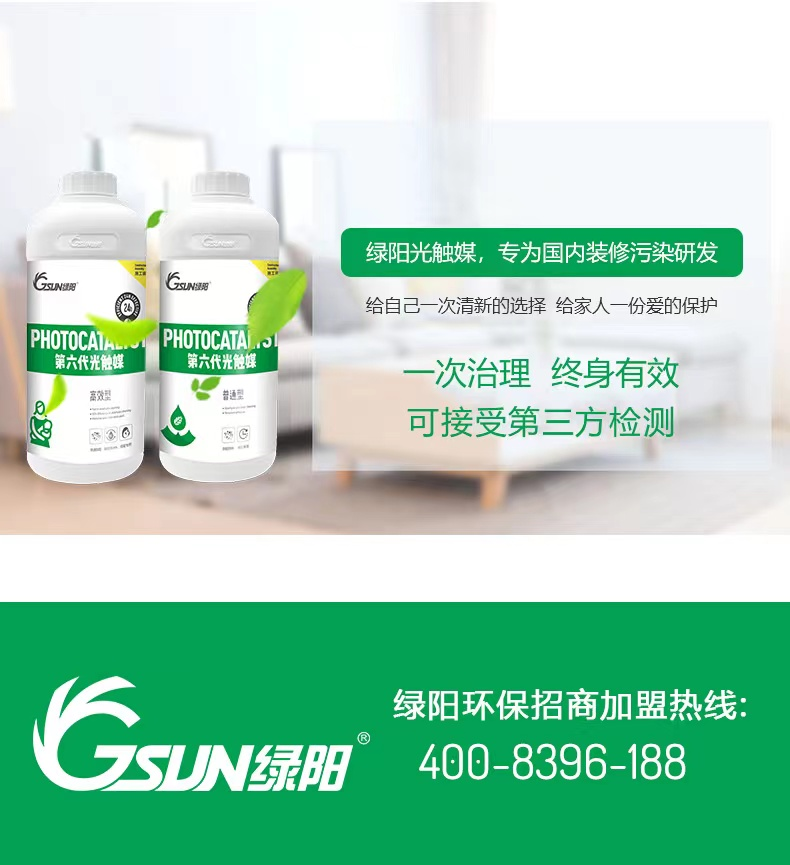 光觸媒是一種以納米級二氧化鈦為代表的具有光催化功能的光半導體材料的總稱,通過高壓噴槍將其涂布于基材表面,形成一層納米篩網狀保護層,能夠對室內空氣中的甲醛、苯、TVOC等有害物質進行有效降解,生成無毒無害的二氧化碳和水,且不會產生二次污染。又因為其只作為催化劑,本身不參與反應而被消耗掉,所以只要保護層不被破壞,其除污能力會持續(xù)有效。